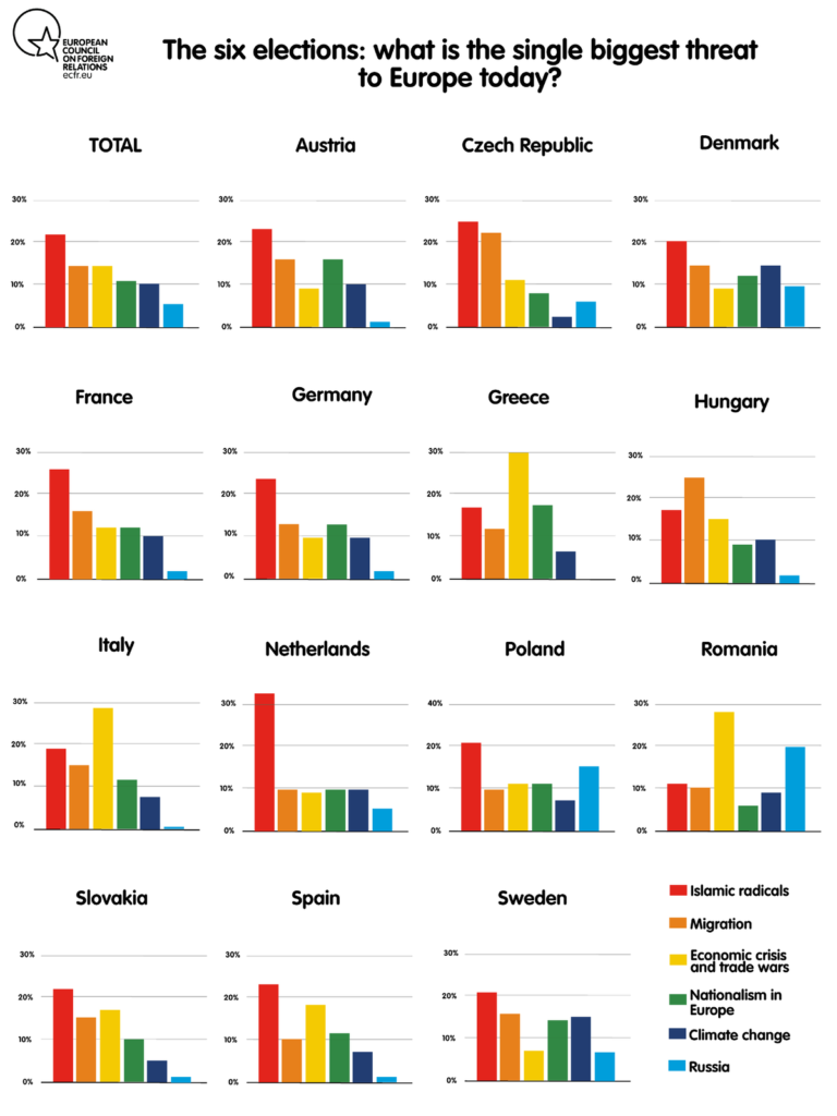Az ECFR nevű európai kutatóintézet legutóbbi, országonként 4000 fő megkérdezésével készült kutatása szerint az európai emberek többségét elsősorban a radikális iszlám aggasztja, ezt követi sorban a migráció és a gazdasági kihívások. A kutatást a 444.hu szemlézte.