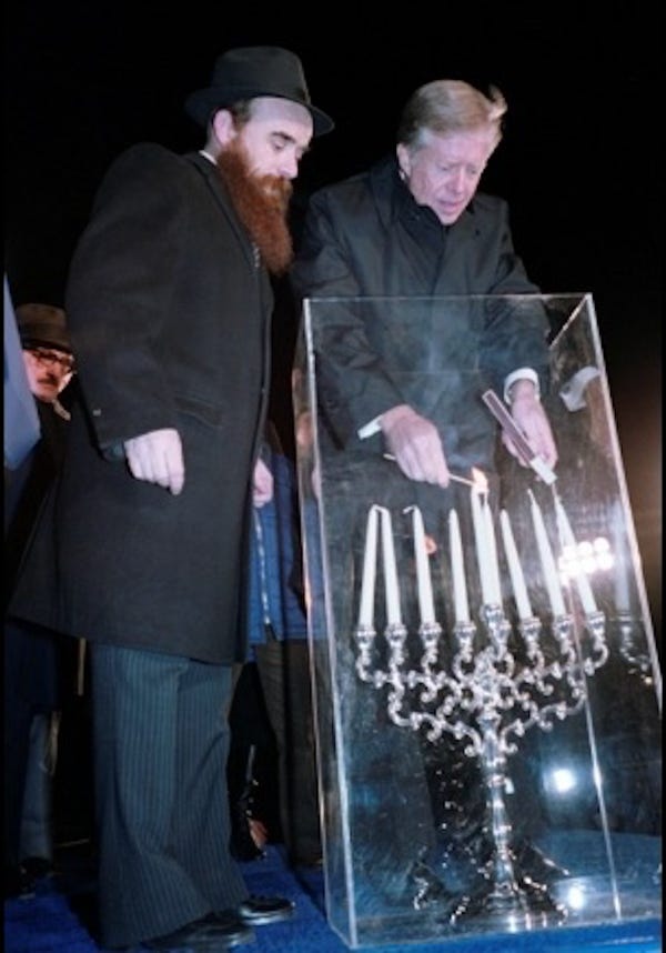 A hanuka amerikai köztudatba kerülésével még több mint egy fél évszázadot kellett várni. 1979. december 17-én Jimmy Carter elnök kisétált a Lafayette Parkba, ahol a helyi Chábád-Lubavics kezdeményezésre felállított menórát gyújtotta meg és egy rövid beszédet is tartott. Irónikus módon, habár szép gesztust tett a zsidók felé, pont ő volt az a demokrata elnök, aki szemükben a történelem egyik legkevésbé favorizált elnöke volt: amikor egy évvel később választásokat tartottak, akkor a zsidó szavazatok kevesebb mint felét kapta meg, kevesebbet, mint 1928 óta bármelyik demokrata jelölt.