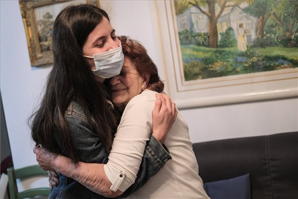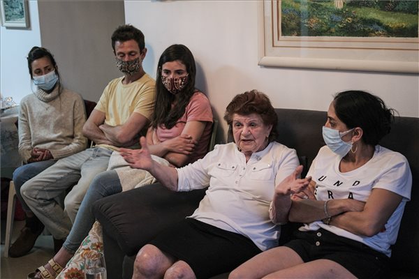 Mann-Schőner Gizella, Gitta néni, 91 éves, magyar származású holokauszttúlélő jeruzsálemi otthonában beszéli el élete történetét érdeklődő fiataloknak a zsidó naptár szerinti (Niszán hó 27.) holokauszt emléknap (Jom Hásoá) előestéjén 2021. április 7-én.