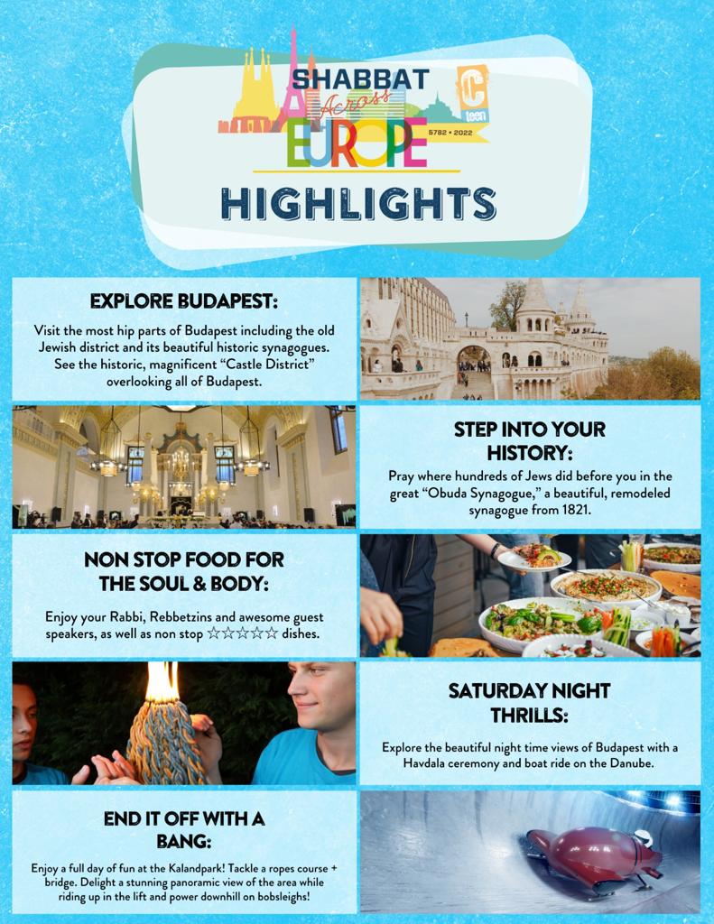 A gazdag program során a fiatalok meglátogatják a főváros nevezetességeit, köztük az egykori zsidónegyedet és történelmi zsinagógáit, valamint a Budai Várat. Időt töltenek majd vallási vezetőikkel, színvonalas előadásokat hallgatnak, illetve az 1821-ben épült, a közelmúltban felújított Óbudai Zsinagógában imádkoznak. A szervezők hajókirándulásra és kalandparkban is elviszik majd a fiatalokat, akik – itt tartózkodásuk teljes ideje alatt – kóser ellátást kapnak.