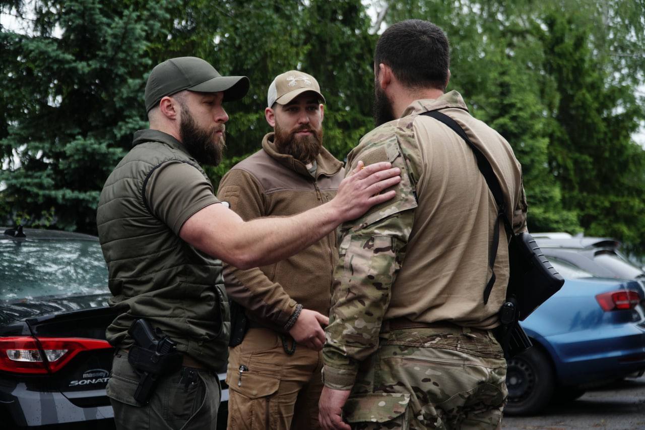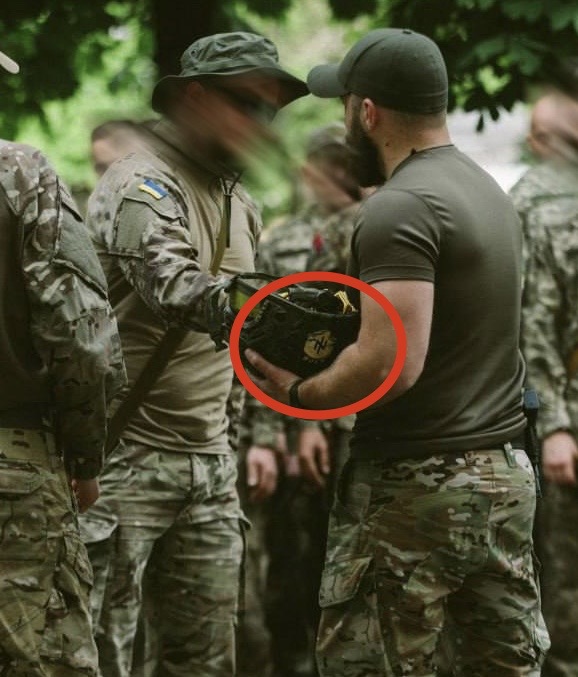 Zorin (baseball sapkában) például egy, az alakulat wolfsangellel díszített rohamsisákból osztotta ki a katonáknak az új jelvényeiket Harkivban.