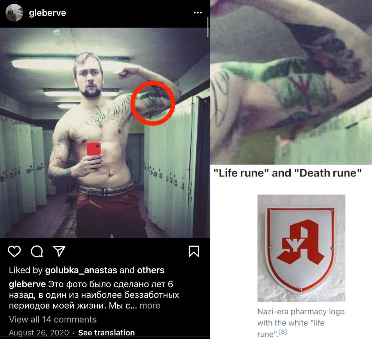 A Kijevszkaja Pravda ukrán hírportál olyan képeket tett közzé, amelyeken fasiszta és náci szimbólumok láthatók Erve fejére és karjára tetoválva.
