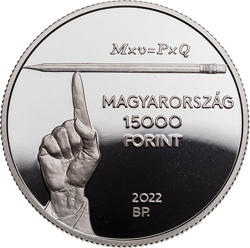 A közlemény szerint az ezüst és a színesfém emlékérmék érmeképei megegyeznek, csak az értékjelzésben térnek el. Az emlékérme előlapjának központi motívuma egy ceruzát egyensúlyozó kezet ábrázol. A ceruza Milton Friedman előadásain rendszeresen megjelenő eszköz volt, amelyet szemléltető példaként használt a szabadpiaci hatások és a társadalmi együttműködés összefüggéseinek megismertetésére. A ceruza ábrázolása fölött a mennyiségi pénzelmélet friedmani újraértelmezésében központi szerepet játszó, a pénz forgalmi egyenletét leíró képlet –