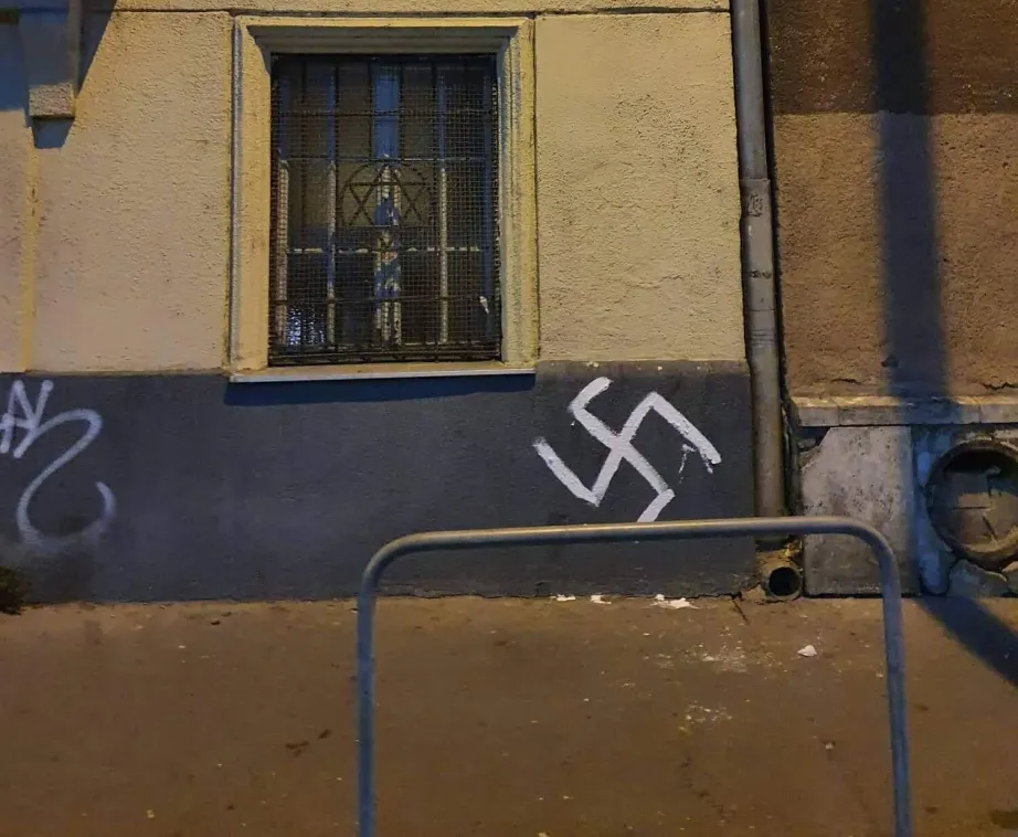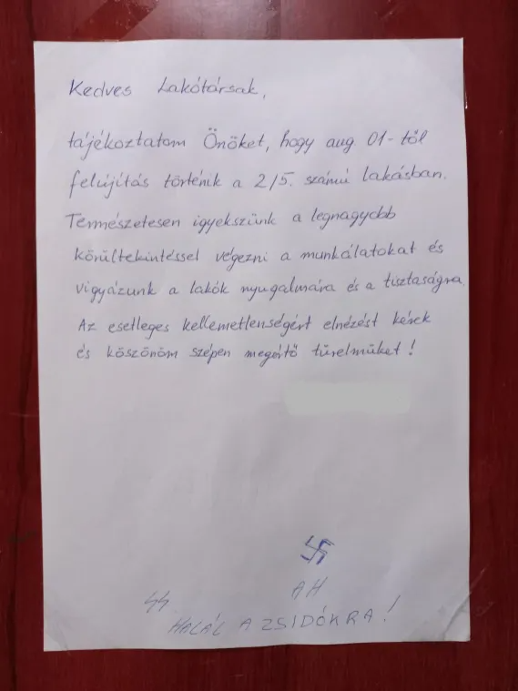 A zsinagóga különterméhez vezető liftben kifüggesztett, lakásfelújításról szóló lakóközösségi tájékoztatóra pedig azt írták két nappal korábban, hogy “halál a zsidókra!”.