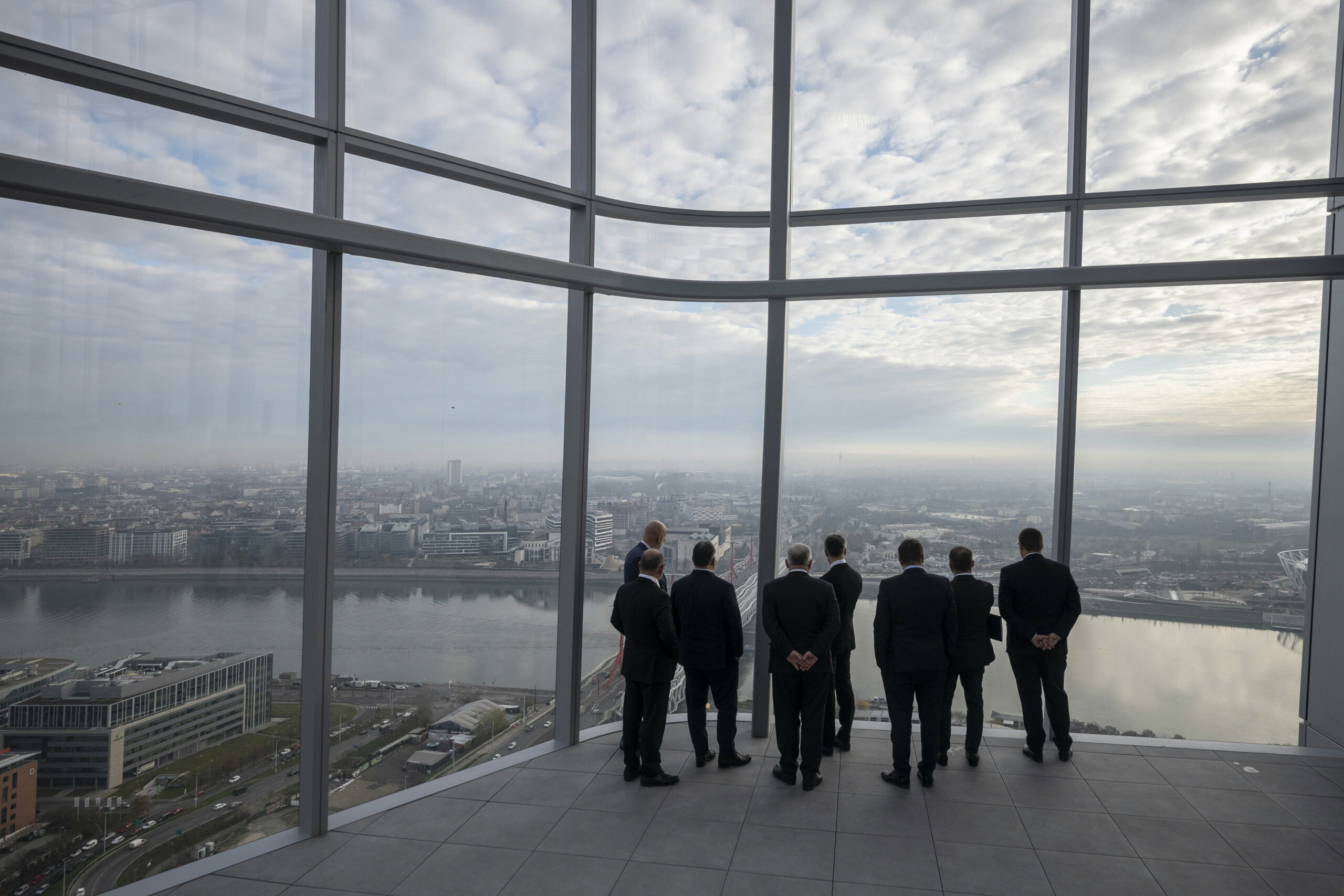 Budapest, 2022. december 8. A Miniszterelnöki Sajtóiroda által közreadott képen Orbán Viktor miniszterelnök (háttal, b3) Hernádi Zsolt elnök-vezérigazgató (háttal, b4) társaságában megtekinti az új MOL Campus székházat, mielõtt a cég vezetésének meghívására részt vesz a MOL-csoport igazgatósági ülésén 2022. december 8-án. MTI/Miniszterelnöki Sajtóiroda/Benko Vivien Cher