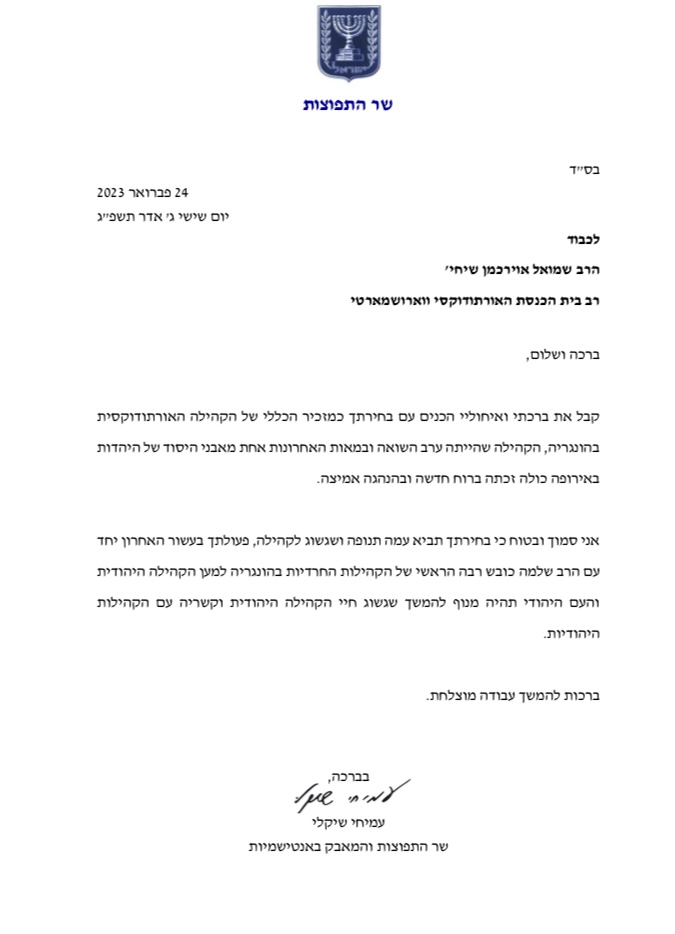 – írta Chikli Oirechman Smuelnek, a MAOIH most megválasztott főtitkárának és a Vörösmarty utcai imaház vallási vezetőjének.