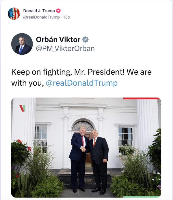 Trump hétfőn kommentár nélkül megosztotta Truth Social közösségi médiaoldalán Orbán Viktor őt támogató tweetjét.