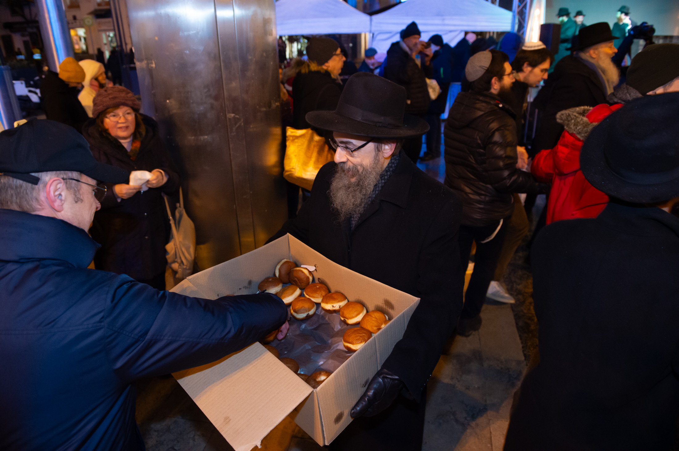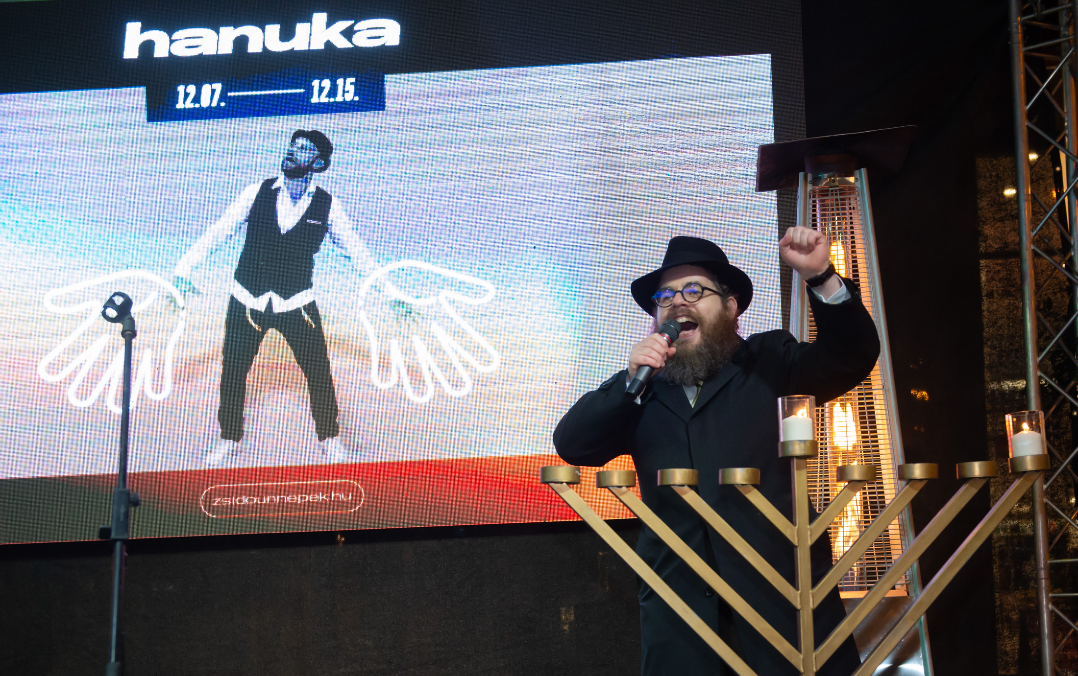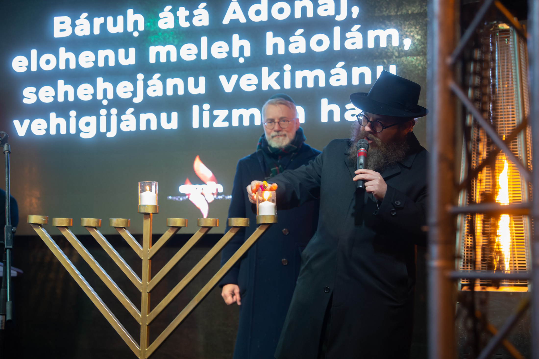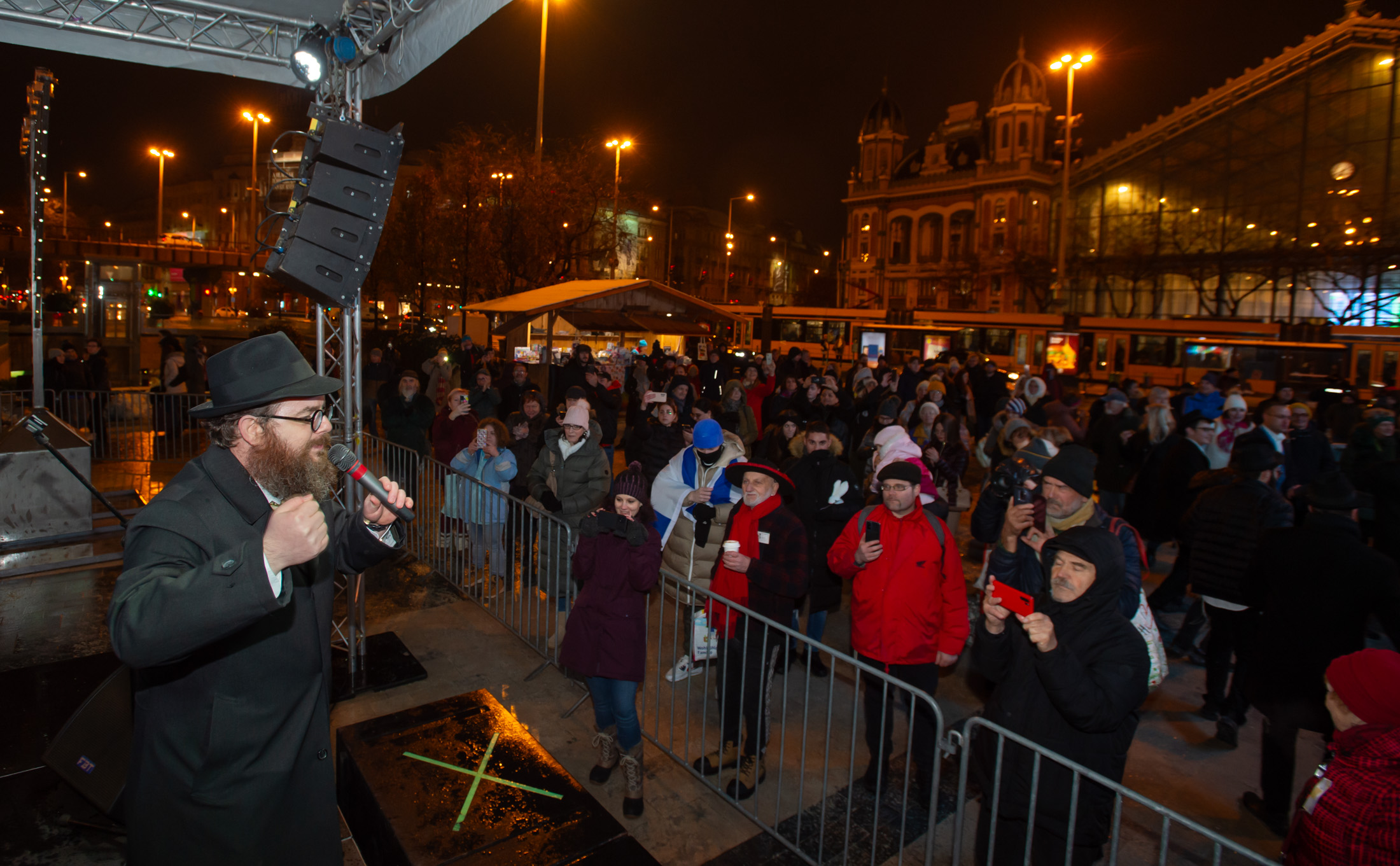 Immár 25 éve kerül sor a nyilvános hanukai gyertyagyújtásra a Nyugati téren. Idén az ünnepnek különös jelentősége van az Izraelt ért terrortámadás és az annak nyomán kialakult háború miatt” – fogalmazott beszédében Köves Slomó, az EMIH vezető rabbija.