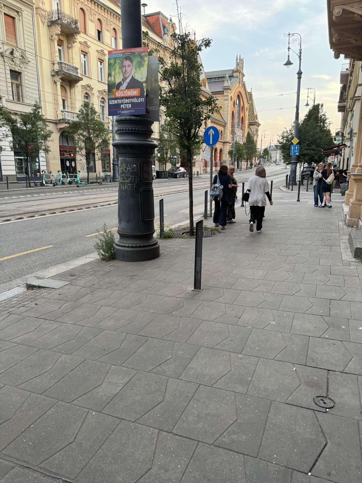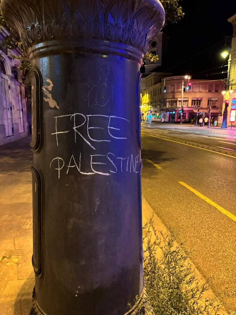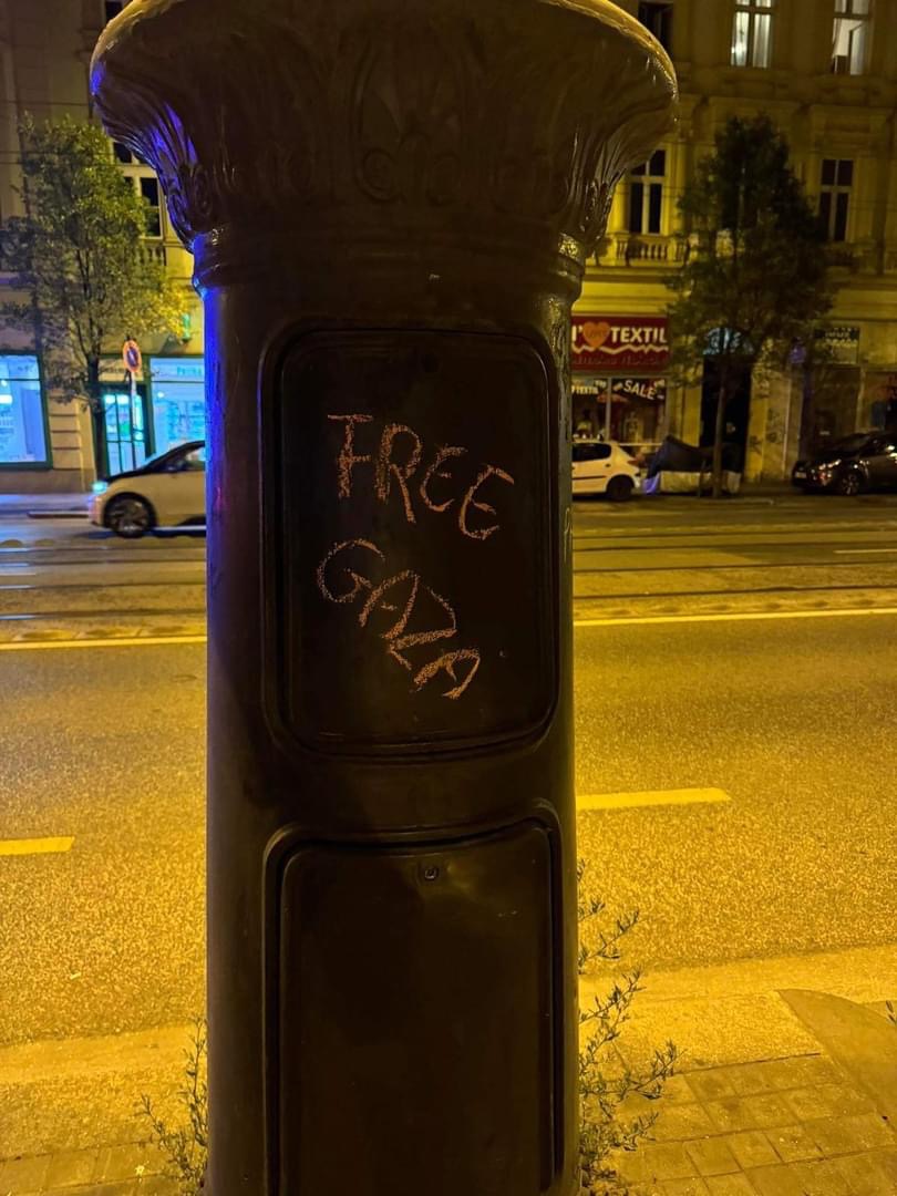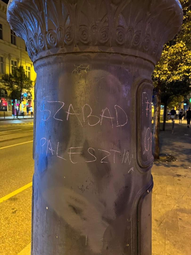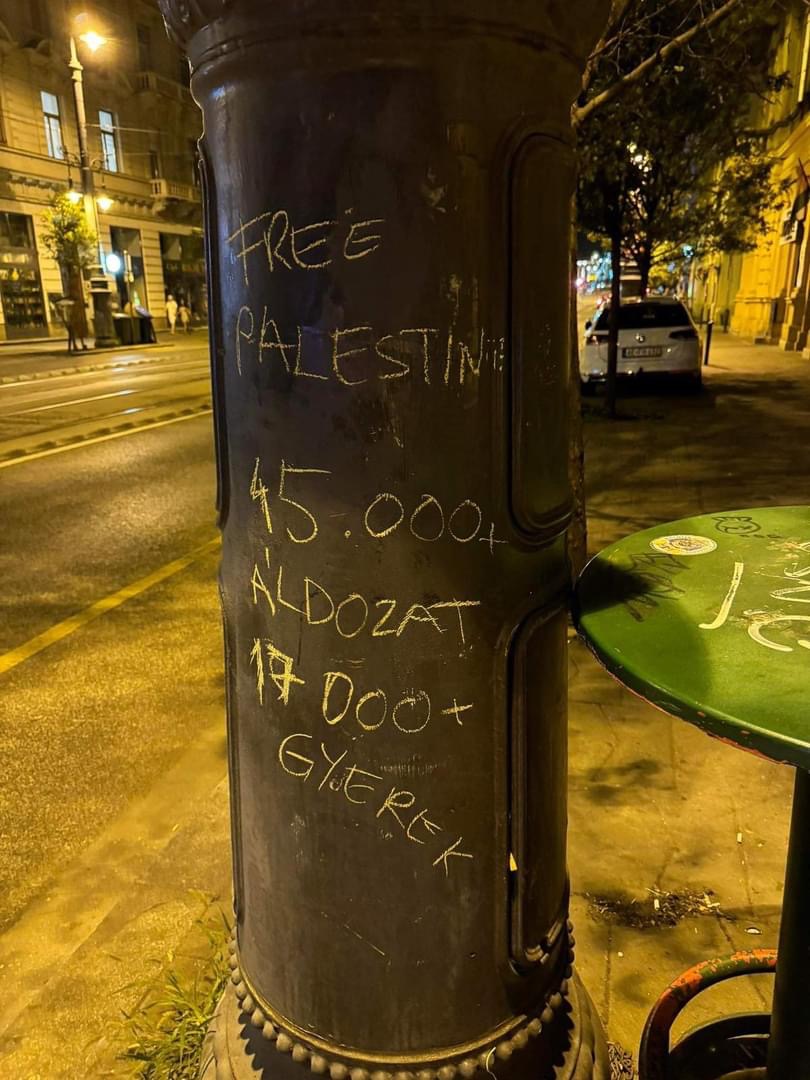 Egy csapat lány a Kiskörúton egy sor oszlopra a következő feliratokat firkálta fel: Szabad Palesztinát, Free Gaza, 45 ezer áldozat – 17 ezer gyerek – számolt be róla a Hetek.