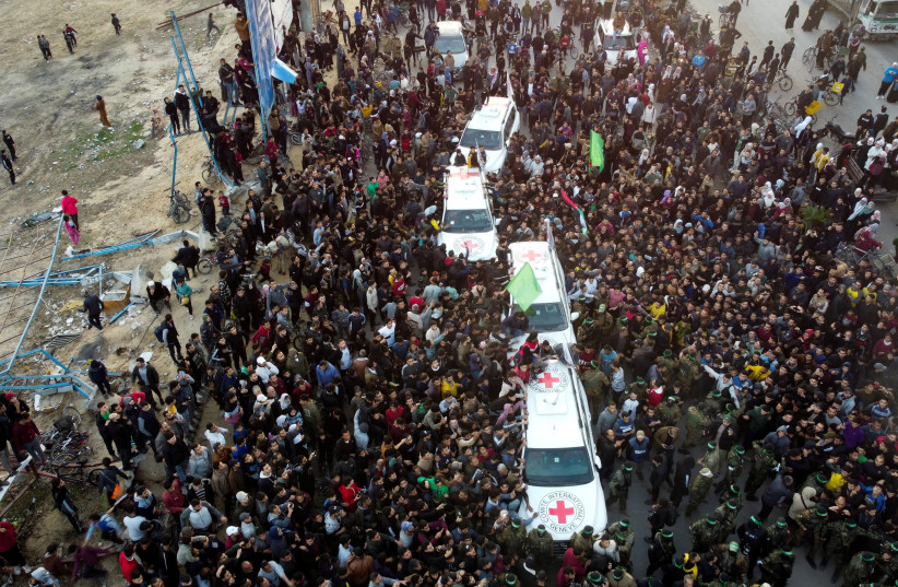 A 471 napig a Hamász fogságában tartott három túszt átadását a Hamászt éltető tömeg, állig felfegyverzett, maszkos harcosok, a Hamász zászlóit lengető és fejkendőjét viselő fiatalok (köztük gyerekek) figyelték, kéjes örömmel, a terrorcsoport győzelmeként ünnepelve az eseményt.