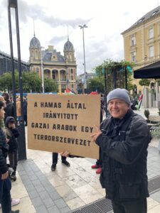 Az első felszólaló, Simó Endre, a Magyar Békekör elnöke a jelenlévők mély megdöbbenésére üdvözölte, hogy a Hamász beleegyezett az összes megmaradt izraeli túsz szabadon bocsátásába, és elítélte a terrorszervezet 2023. október 7-i véres terrortámadását.