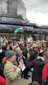 A mindent elborító szeretet jegyében a tüntetésen folyamatosak voltak az olyan közismert palesztinpárti skandálások, mint a „Szabad Palesztinát”, de volt „From the River to the Sea”, és „halál az IDF-re!” is.