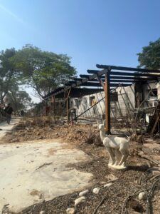 Az idilli kis település számos egykori otthona helyén ma leégett házszerkezetek állnak, előttük fekete vagy sárga zászlókkal. A sárga a túszként fogvatartottakat jelölte, a fekete pedig a meggyilkoltakat. Van olyan ház, ahol mindkettő zászló ki van téve, mivel az ott élőt túszként elrabolták és Gázában ölték meg. A felgyújtott házakban még megtalálhatók a korábban ott élők személyes tárgyai: poharak, villák, tortaformák, sőt egyes házak előtt apró gyerekjátékok is hevernek.