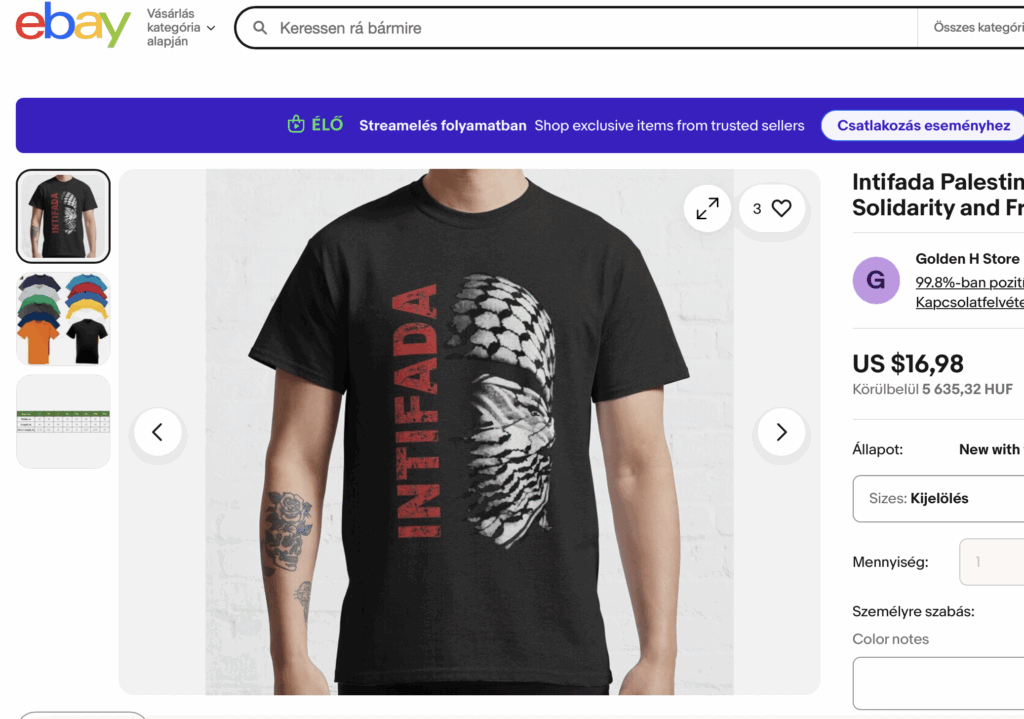 Miközben a nagy online piacterek a biztonságos és erőszakmentes környezet fenntartásáról beszélnek, a „Halál az IDF-re” feliratú pólók és az intifáda dicsőítésére szolgáló árucikkek továbbra is akadálytalanul elérhetők az Etsy és az eBay oldalain.