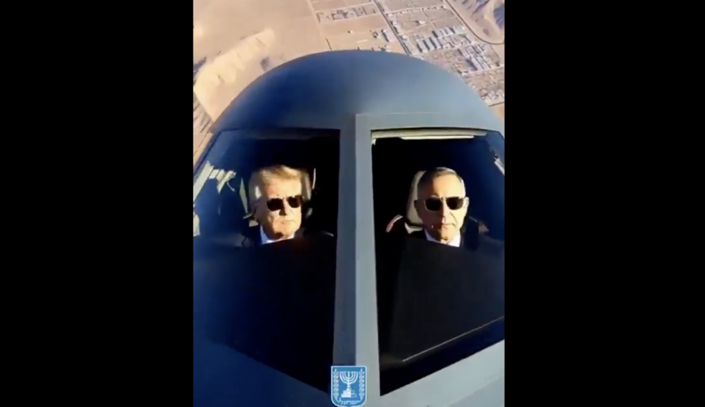 Egy mesterséges intelligencia segítségével készült videót tett közzé Benjamin Netanyahu miniszterelnök hivatala, amelyen Netanyahu és Donald Trump amerikai elnök egy lopakodó-vadászgép pilótafülkéjében ülve repülnek egy sivatagosnak tűnő terület felett.