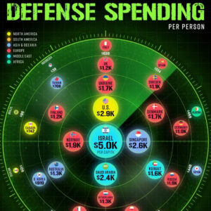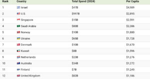 A Visual Capitalist által közzétett adatok szerint Izrael 2024-ben csaknem 5000 dollárt – pontosan 4989 dollárt – költött védelemre fejenként. Bár Izrael teljes, 47 milliárd dolláros védelmi költségvetése eltörpül az Egyesült Államok 997 milliárd, illetve Kína 314 milliárd dolláros kiadásai mellett, az egy főre jutó ráfordítás tekintetében nincs párja.