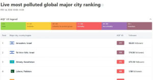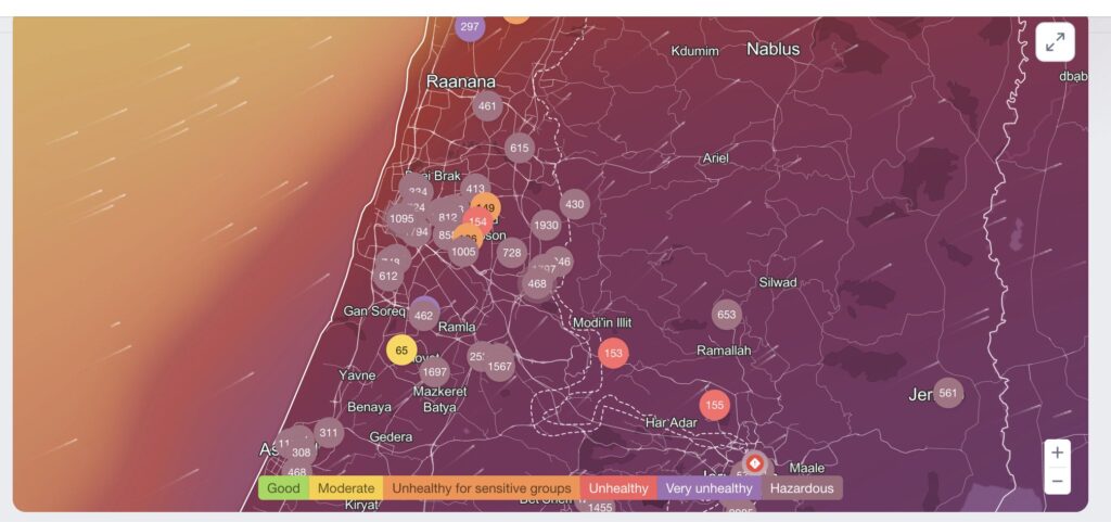 Izrael levegőminősége szombaton jelentősen romlott, Jeruzsálem és Tel-Aviv az IQAir élő rangsorában a világ legszennyezettebb nagyvárosai között szerepeltek. Az égbolt felhős, narancsszürke volt, a látótávolság jelentősen csökkent, és az ország egész területén a mérőállomások nagyon magas légszennyezettségi szinteket jeleztek.