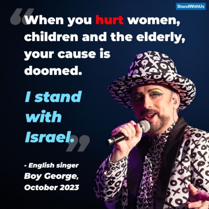 Az október 7-i izraeli mészárlás után Boy George egy – mára már törölt – bejegyzést tett közzé a közösségi médiában, amelyben azt írta: „Ha nőket, gyermekeket és időseket bántasz, az ügyed kudarcra van ítélve. Izrael mellett állok.” A posztért a közösségi médiában felrakták a „cionista zenészek” feketelistájára.